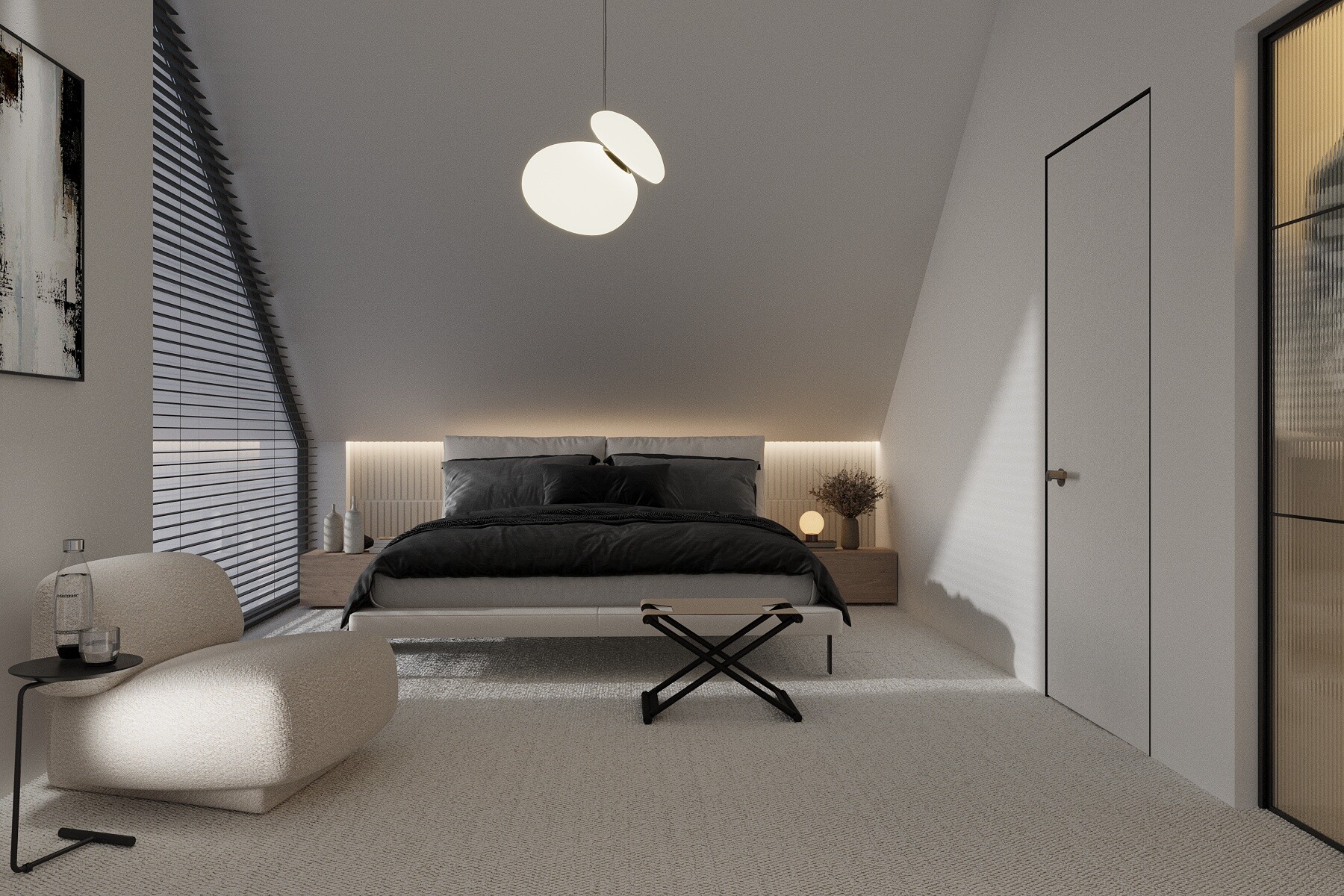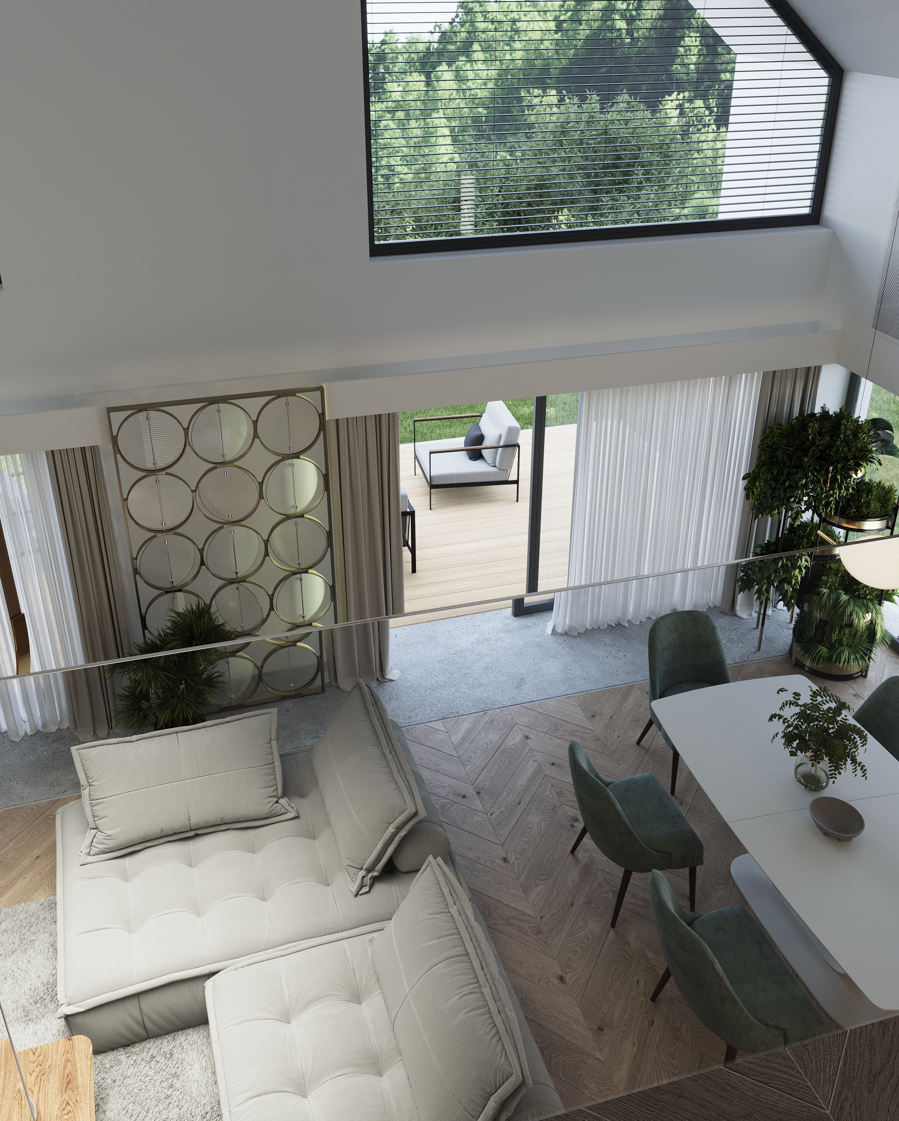 WERSJA z antresolą (4 pokoje): nowoczesny budynek z wysokim salonem, zaprojektowano antresolę na której mamy dwie sypialnie, garderobę oraz łazienkę.